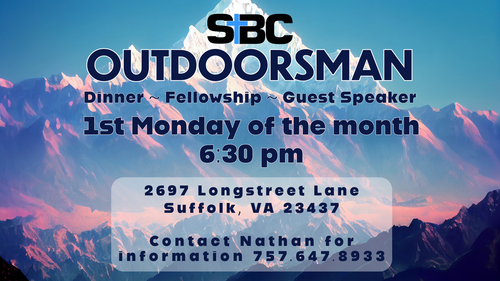 The first Monday of each month men from different walks of life come together for a time of great food, fellowship, and studying God's Word together. Being an outdoorsman is not at all a requirement so come out to Outdoorsman!